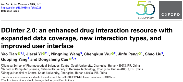 近日,91AV 曹东升教授团队在国际权威期刊《Nucleic Acids Research》(IF=16.6)发表了题为“DDInter 2.0: an enhanced drug interaction resource with expanded data…