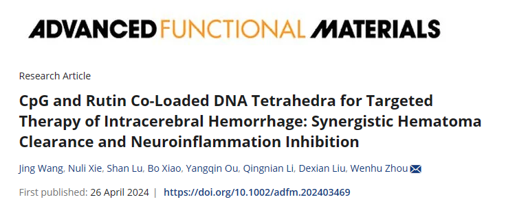 湘雅医院肖波教授团队合作,在Advanced Functional Materials(中科院1区Top期刊,IF=19)杂志上以Research Article形式发表题为“CpG and Rutin Co-Loaded DNA Tetrahedra for Targeted Therapy of Intracerebral Hemorrhage: Synergistic Hematoma Clearance and Neuroinflammation Inhibition(共载CpG和芦丁的DNA四面体靶向治疗脑出血:协同清除血肿和抑制神经炎症)”的原创研究论文。