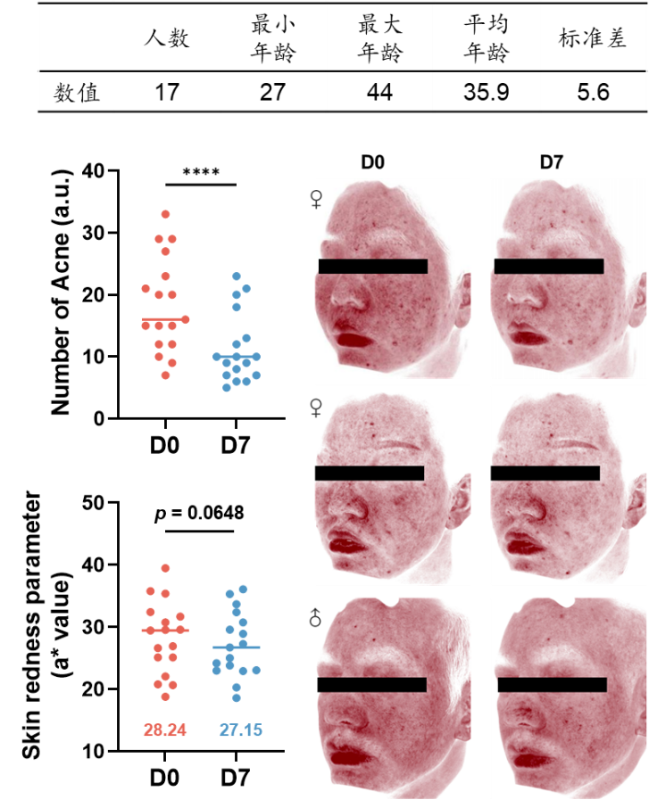 值得注意的是,17例受试者双盲对照显示,治疗7天后患者炎性丘疹和红斑指数显著下降。本研究通过简单的纳米设计,首次实现了“杀菌-微生态平衡-修复”三位一体的痤疮治疗策略,并突破性地解决了金属抗菌剂的选择性难题,为皮肤疾病精准治疗提供了新范式。