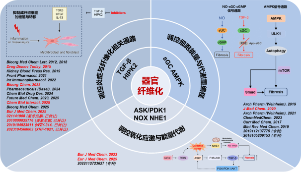 重大疾病小分子药物研发团队是器官纤维化湖南省重点实验室的核心力量,科研成果突出,在国内外具有广泛影响力。团队长期围绕肝、肺、肾等器官纤维化以及肺动脉高压、心衰、银屑病和肿瘤等重大临床需求,开展从靶点发现、药物设计与优化、成药性评价到临床前研究的全链条创新药物研发。