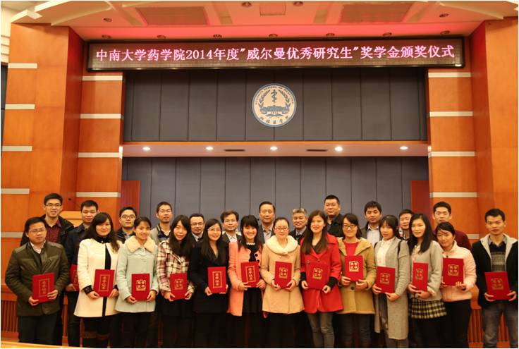 据悉:“威尔曼优秀研究生”奖学金共包括两个奖项,即“学习优秀奖学金”和“创新研究奖学金”。“学习优秀奖学金”用于奖励学业优秀的研究生,”创新研究奖学金”用于资助高年级研究生从事新药开发创新研究。本届“科研创新奖”由2012级博士研究生刘治国、硕士研究生李佩两位同学获得,“学业优秀奖”由唐密密等20位同学获得。