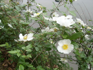 金樱子Rosa laevigata Michx. 蔷薇科蔷薇属。常绿蔓性灌木,无毛;小枝除有钩状皮刺外,密生细刺。小叶3,少数5,边缘有细锯齿,两面无毛,背面沿中脉有细刺;叶柄、叶轴有小皮刺或细刺;托叶线形,和叶柄分离,早落。花单生侧枝顶端,白色,其根皮可提制栲胶;果实入药,有利尿、补肾作用;叶有解毒消肿作用;根药用,能活血散瘀、拔毒收敛、祛风驱湿。