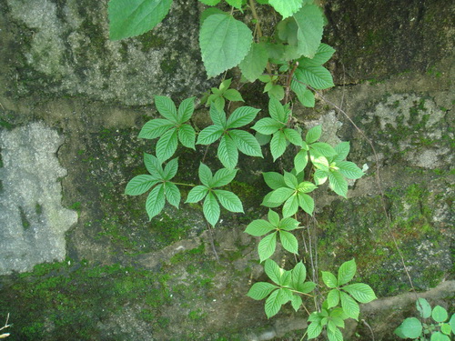 五叶爬山虎葡萄科爬山虎属,别名叫做五叶地锦、爬墙虎。落叶大藤本,具分枝卷须,卷须顶端有吸盘,掌状复叶,具五小叶,小叶长椭圆形至倒长卵形,先端尖,基部楔形,边缘有粗锯齿,叶面暗绿色,叶背稍具白粉并有毛。 。聚伞花序,常生于短枝顶端两叶之间。花小,黄绿色。是垂直绿化主要树种之一。