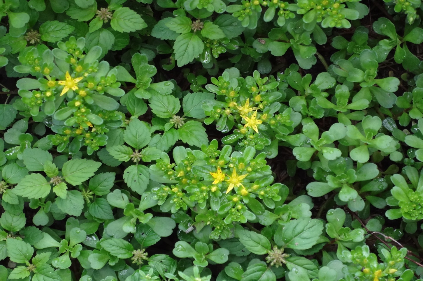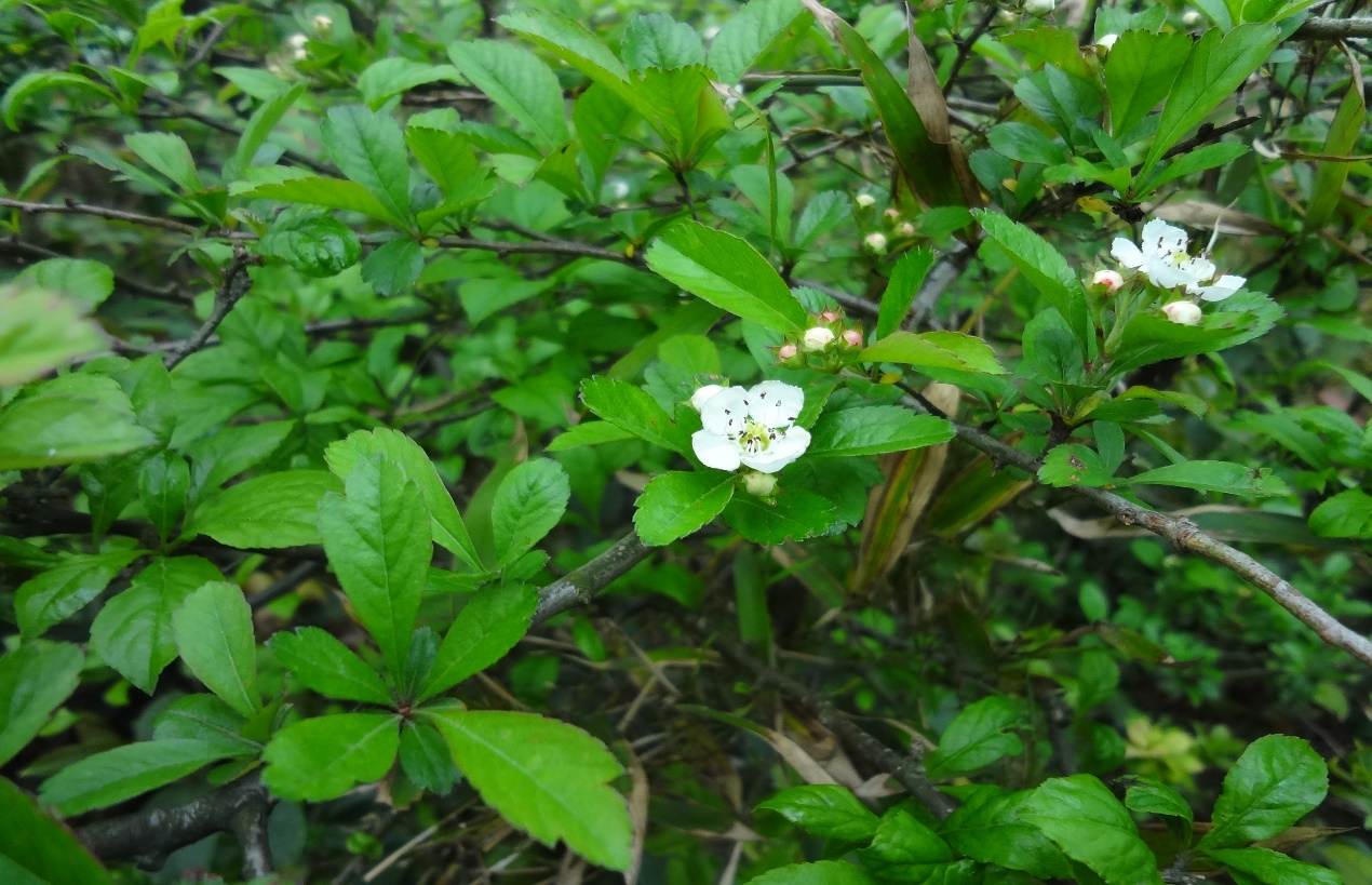 乡间的路不好走,但是植物却比公路旁丰富得多,还看到几棵还没开花的山楂树。路边绿莹莹一片的茶树,都或多或少长着些茶耳。据说,背面表皮脱落,绿色的茶耳最为可口。我尝了几片,果真如此,后来走累了,便吃些茶耳补充补充。途中遇到一小片竹林,大家想去再找些黄精,顺便挖些竹笋。黄精没寻到,竹笋倒是挖了几个,据说他们回宿舍后烫火锅吃了,味道很是不错。大约是九点多上山,这会儿已经接近中午了,阳光逐渐强烈起来,晒得人衣服发热。我们在林子外歇了歇,挖了些开黄花的景天,离开了田垅,跟着老师向山林前进。我们决定从这片林子直接爬到山顶。