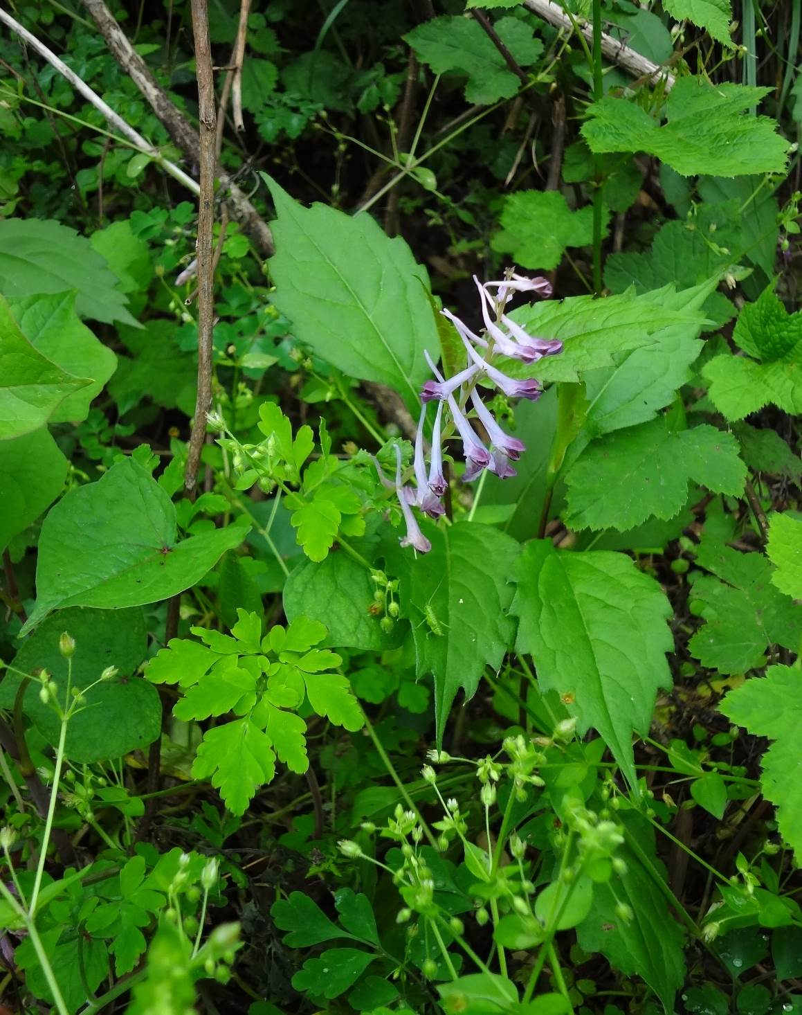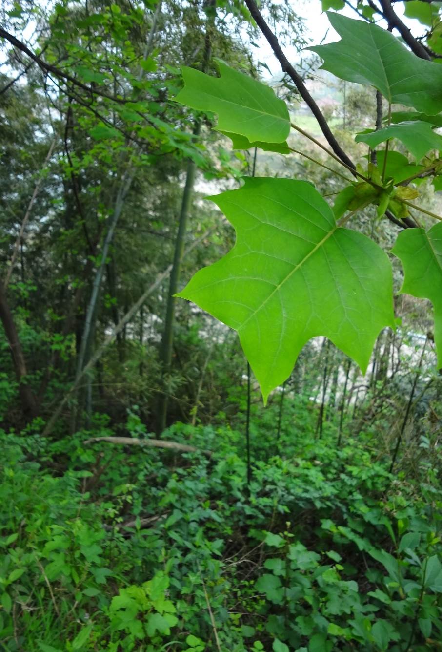 都说山是大自然的恩赐,果不其然,就连路边都有不少有意思的植物。没过多久,便邂逅了紫堇,淡紫色的花瓣,一连串的缀在枝条上,被绿叶衬得十分优雅。不过这山上似乎特产一种黄色条纹的虫子,名为马陆。紫堇旁便有几条,我没注意,凑过去给花拍照,发现这大胖虫子时我吓得手直哆嗦,相机差点砸在地上,立马蔫了精神。往前走了八九步,带队老师说发现了薄荷,我们便都凑过去看。我轻轻扯了片嫩叶,在手里揉了揉,一股凉凉的香气萦绕开来。我顿时神清气爽,又兴致勃勃地爬起山来。同行的伙伴一路采集着标本,我便帮着拍照。后来又看到些大黄和零星几颗黄精,偶尔遇到几颗茶树,茶耳却涩涩的不好入口。最有意思的还是一颗长在路边的鹅掌楸。我只在课本里见过这种植物,这鹅掌楸的叶子倒是十分像一只大鹅掌,名字起的果真是奇思妙想,让人不禁莞尔。后遇到一个小岔路,老师说带我们去吃好吃的茶耳,一行吃货便欢天喜地的离开了公路,下了小坡,直奔田垅。