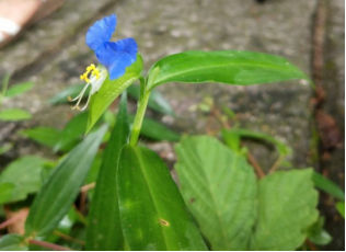 开蓝花的鸭跖草,清热泻火,解毒,利水消肿。叶形为披针形至卵状披针形,叶序为互生,茎为匍匐茎,花朵为聚花序,顶生或腋生,雌雄同株,花瓣上面两瓣为蓝色,下面一瓣为白色,花苞呈佛焰苞状,绿色,雄蕊有6枚。