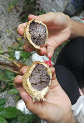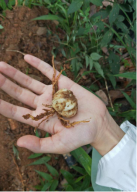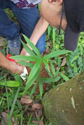 惊喜的是我们在路上碰见了百合,如果不是老师指出来,我们大概只会以为那是一株普通的草,它简单到没有任何修饰,没有我们平日所见到的美丽的花,有的只是纯粹的绿叶。按照理论知识,百合的根是鳞茎,于是三个男生开始了他们的挖掘工作,没想到这是一个“大工程”,顺着百合的细根慢慢挖掘,在将近20min的挖掘工作后,他们成功挖出了百合白色的鳞茎,它有点小,不像我们平时所见到模样。这时老师在一旁说采药也不是一件容易的工作,做任何事情都要努力,成果不是说得到的就是得到的。旅途中有惊喜自然也有困难,因为前一天下了雨,第二天蚊子有些多,大家一路被蚊子咬了好多包,但老师告诉我们马兰的叶可以止痒,于是我们从路边找来了马兰,把叶片在蚊子包上搓碎,止痒效果立竿见影。我们不禁感叹到自然的神奇和魅力。