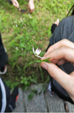 第二天一早8点我们开始了新的旅程。第二天的安排是整整一个白天都在外面。路线的改变带来了与第一天不同的风景,没有沿途的小溪,但却见到了许多不同的植物,如鬼针草、何首乌、商路、千里光、奇蒿、鸡矢藤、陆英、扛板归等等。我们还认识了紫萁和狗脊叶的背面区别、半边莲花的奇特之处、长满了刺的颠茄、可作为芭蕉扇的厚朴、气味独特的鸡矢藤和鱼腥草,以及常作为人参伪品商陆的根。