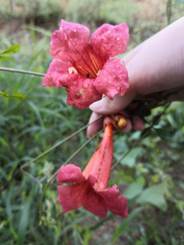 第二天上午八时,大家在贾岭药博园入口处集合,在老师的带领下,开启了今天的进山采药之旅。山脚下的植物已经让人目不暇接,五颜六色的花朵简直惊艳。曾经折服于诗里描述的“艳欹偷醉斜阳里,体弱愁缠立石颠”,今天我们终于见到了自然状态下纯净欲滴的凌霄花。金银花金花银花交错生长,仿佛悬在藤上的一串风铃。还有更多形态各异的,比如辣蓼地菍,不得不说,大自然真的是最神奇的造物主啊。