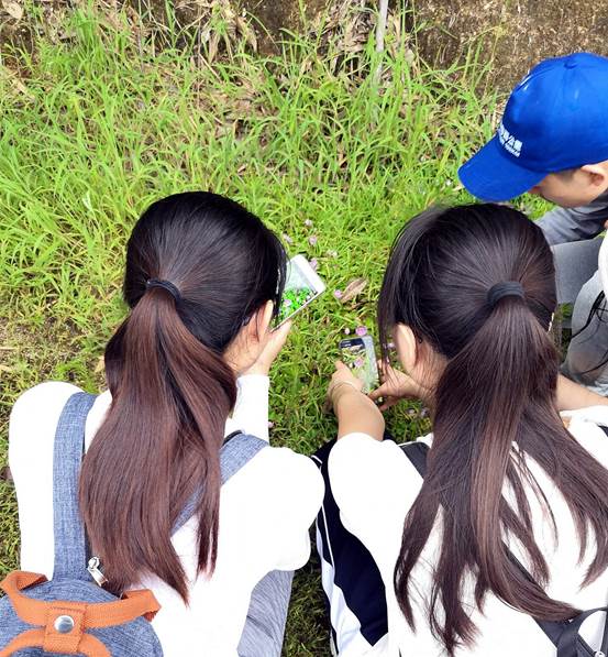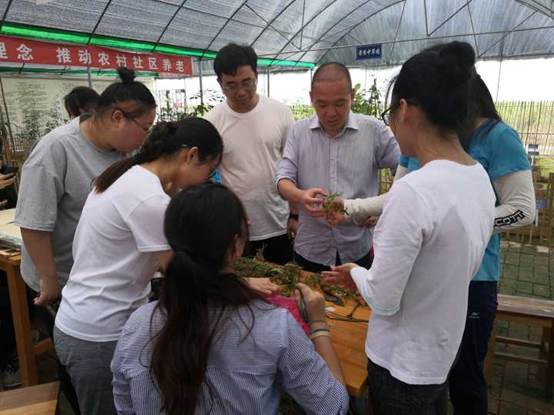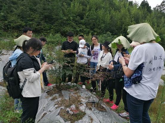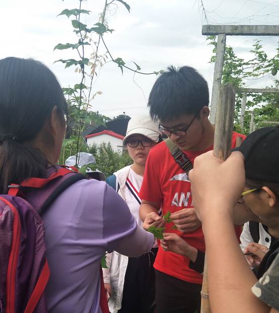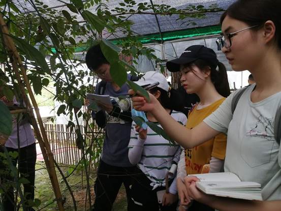 湘雅医院药学部主任药师曾老师在指导学生观察植物细节,根据特征定科属种。